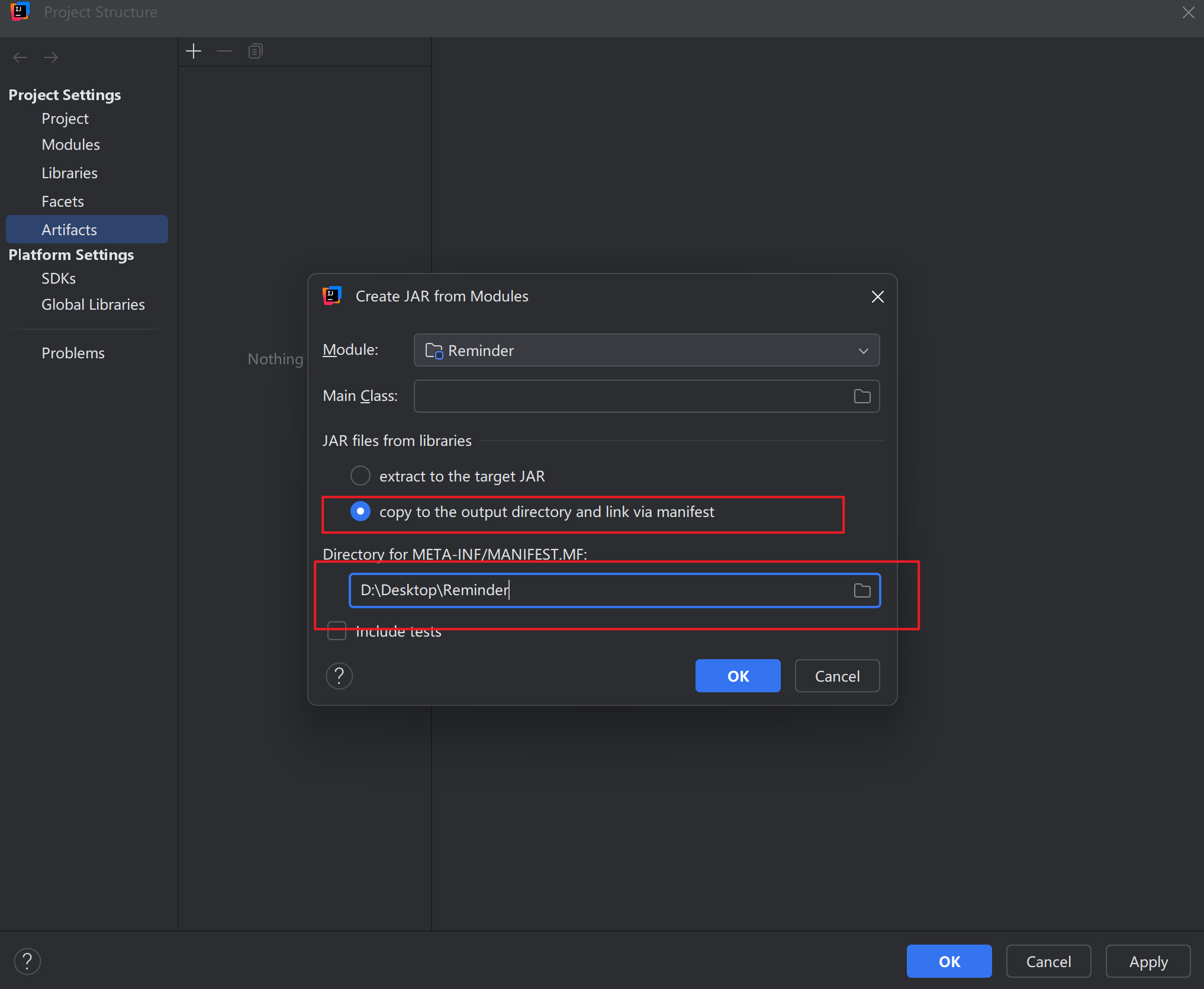 下方的D:\Desktop\Reminder目录只要是项目下的任意目录都可以,推荐选择src目录所在的上一级目录。设置好之后点击OK再点击Apply,确保设置生效。