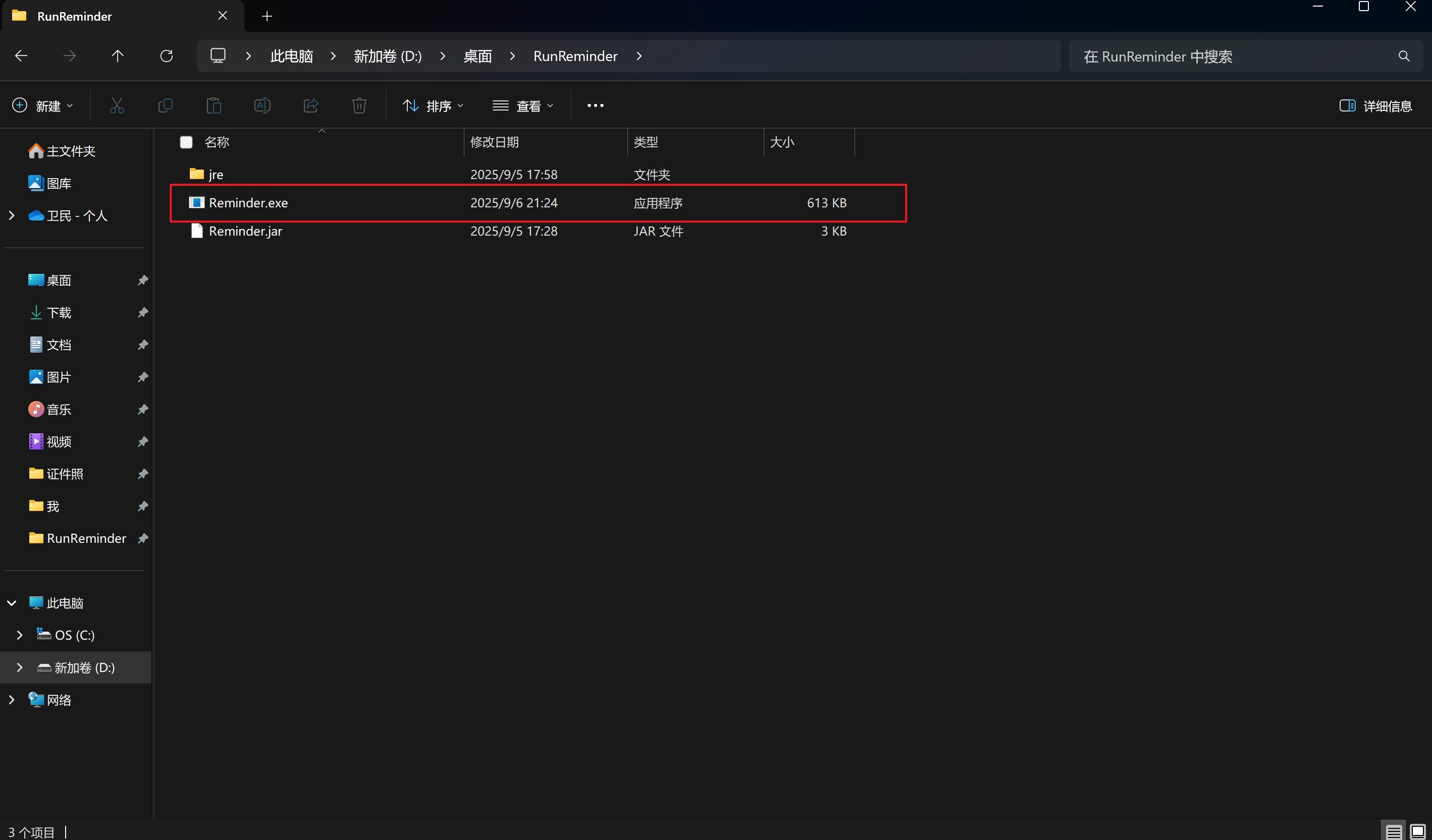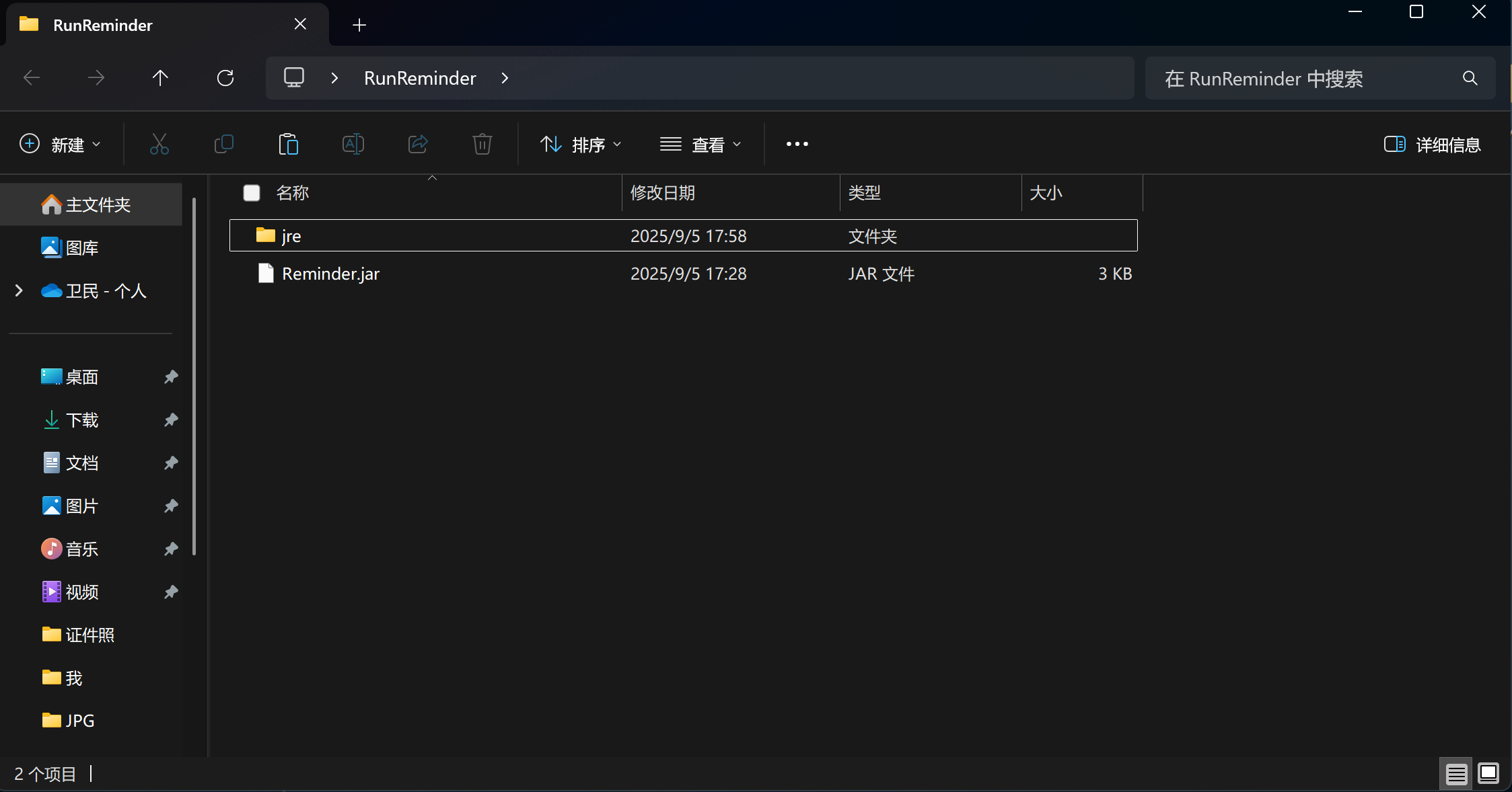在任意位置新建一个文件夹(名称任意取),将上面打包好的jar包放入其中。如果项目中有用到第三方jar包也需要放入其中。如果需要将写好的代码发给别人使用,并且别人电脑上面没有Java环境,则需要把你安装Jdk目录下与bin目录同级的jre目录(Java运行环境)也放入其中。