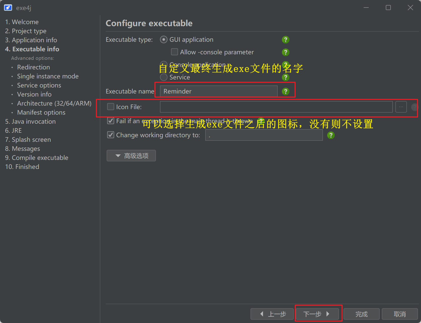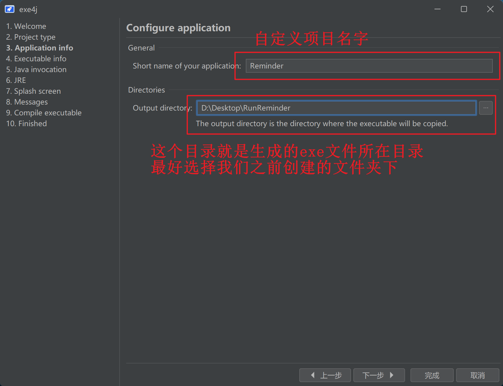 按照下图所说为我们的项目自定义名字,并选择最终生成exe文件所在目录。然后点击下一步。
