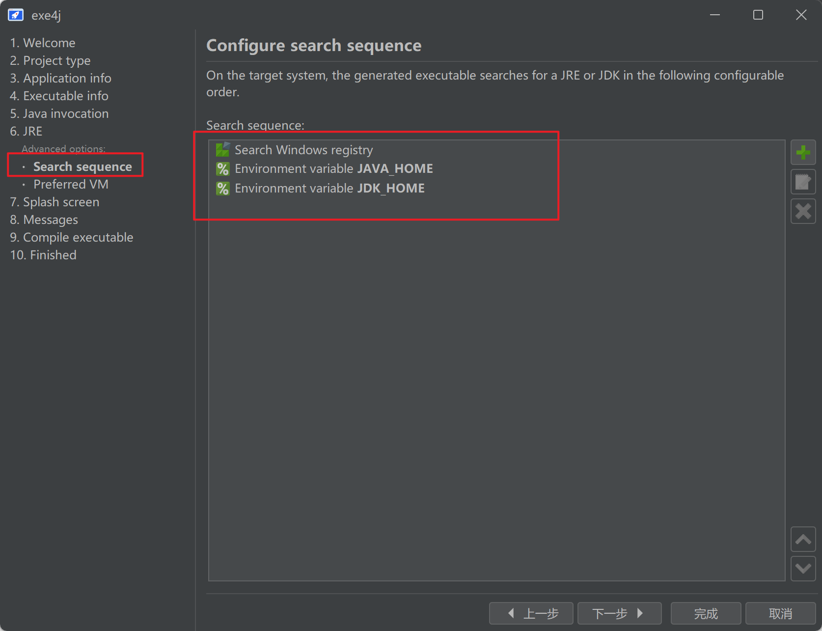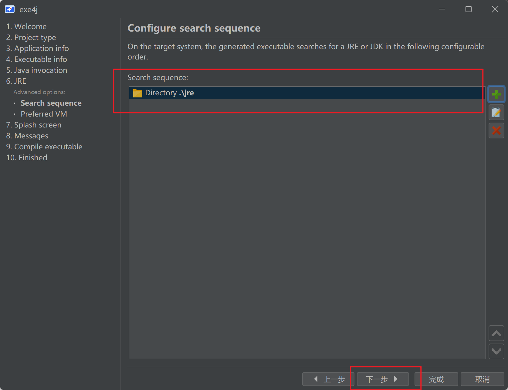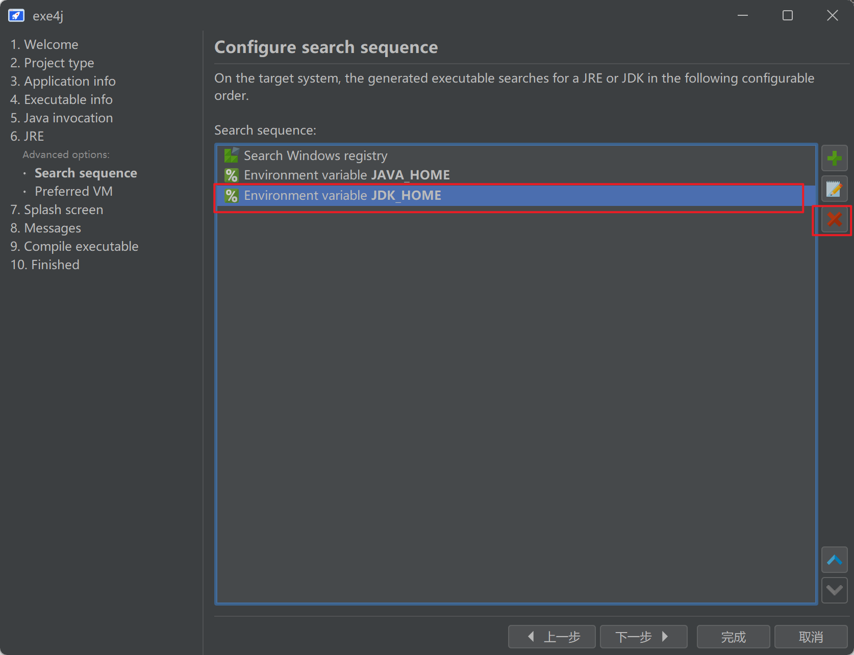 这里默认设置的是找本地Java环境变量中的JDK来运行程序,但是我们需要在没有Java环境的电脑中也能运行。需要把上面三个全部 x 掉。依次点击三项,并点击右边的 x。