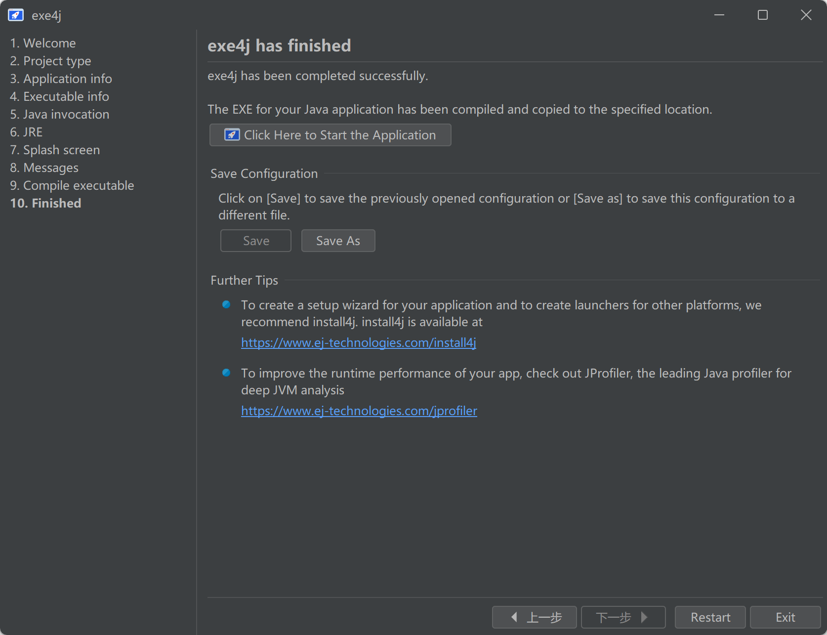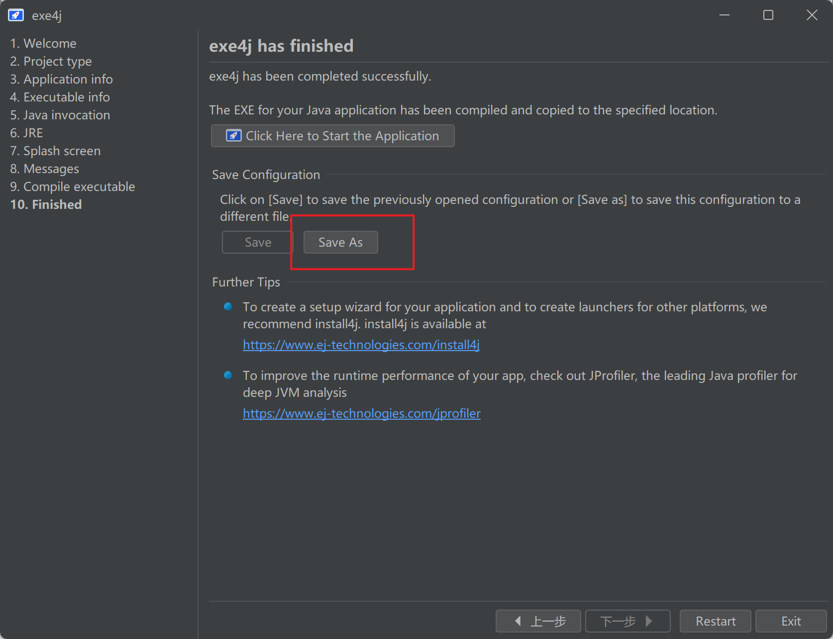 第一次在exe4j中操作完之后先别急着关闭。点击Save As,会让你选择一个目录把当前配置保存。推荐选择之前我们创建的那个文件夹。