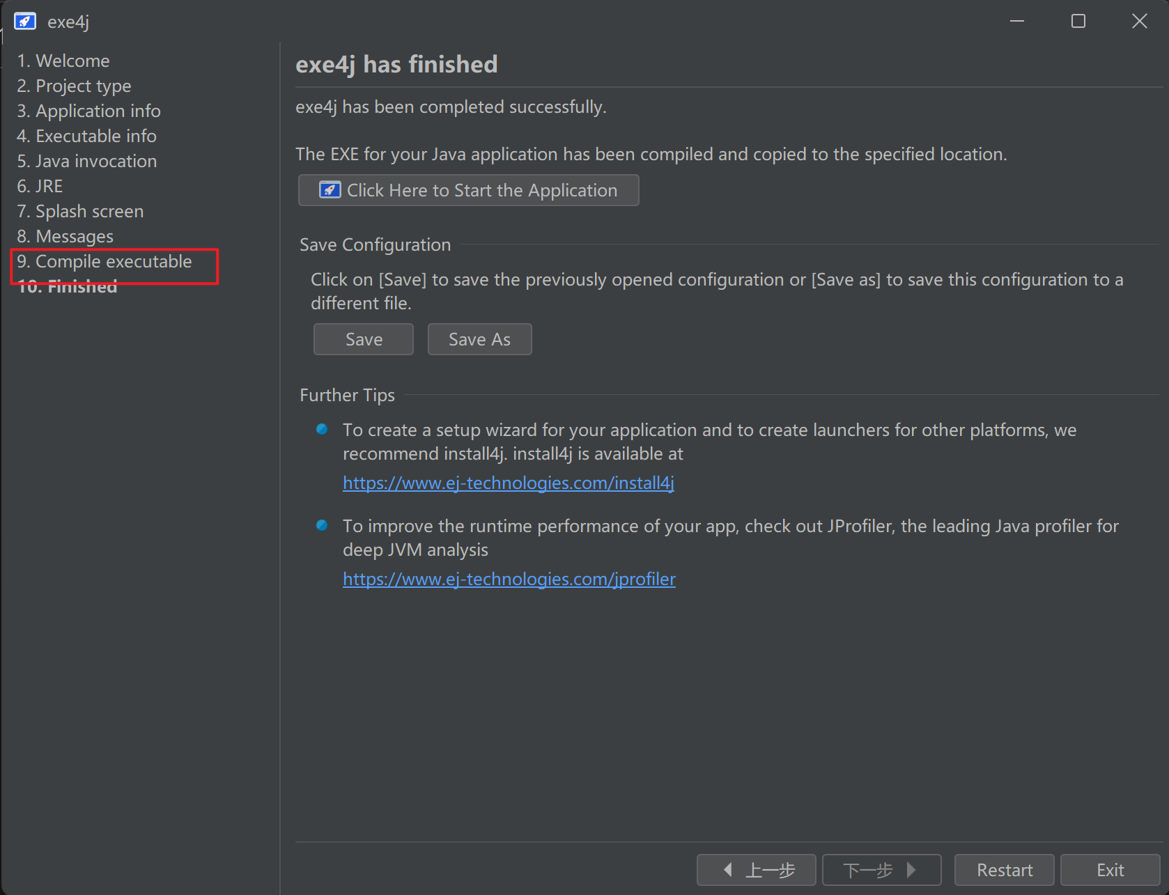 之后要更新程序,只需要在Idea中重新把项目打包成Jar包,并替换此Jar包。第三方Jar包不用管因为我们第一次已经加入了。然后点击后缀是.exe4j的文件,等其打开后点击 Compile executable,就会重新生成exe文件。